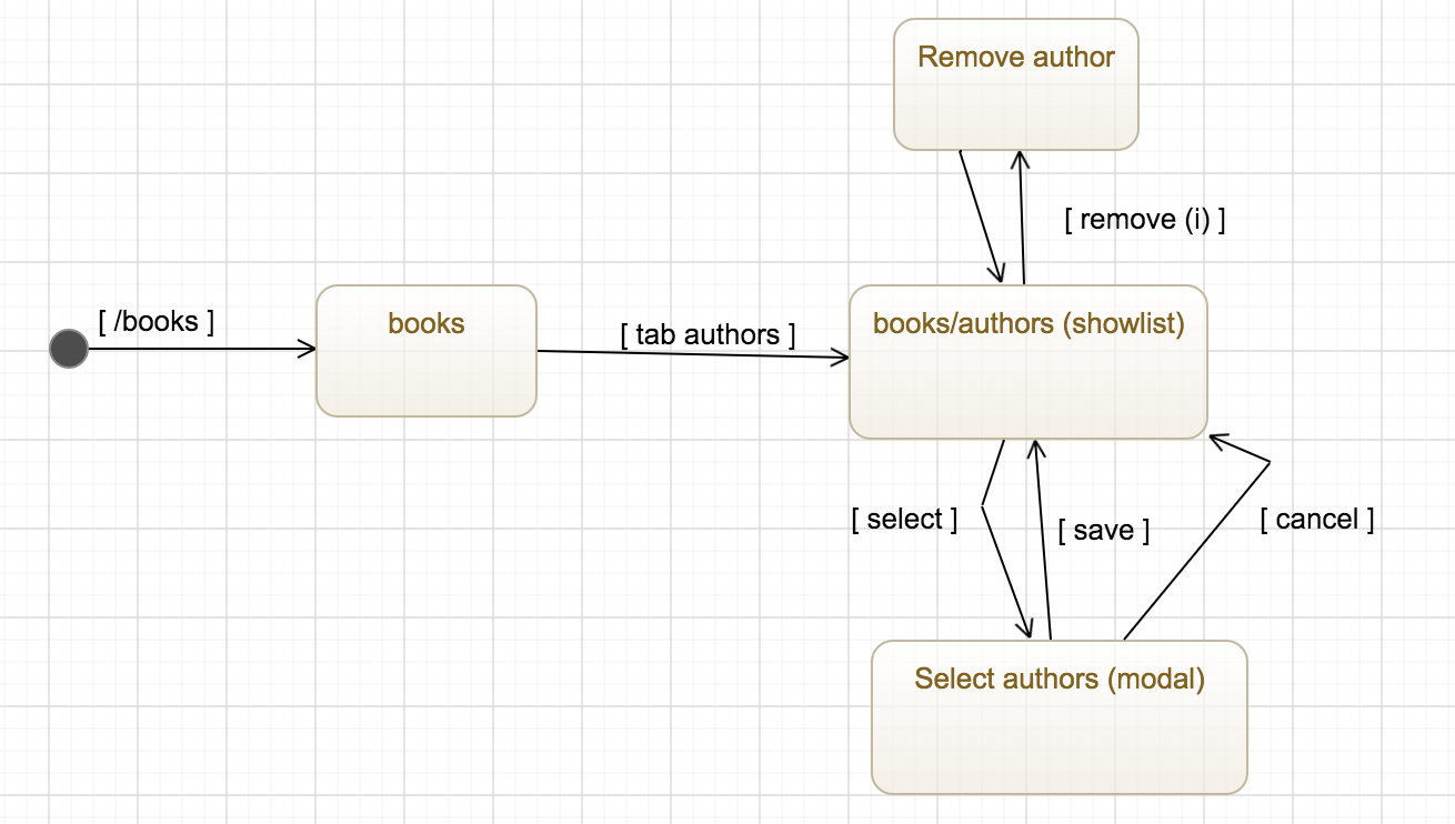 Cuando se selecciona el tab autores, se despliega la lista de autores del libro y se puede eliminar una asociación o escoger la opción de cambiarlos vía un botón de selección. La selección de los autores se hace utilizando un dialogo modal.