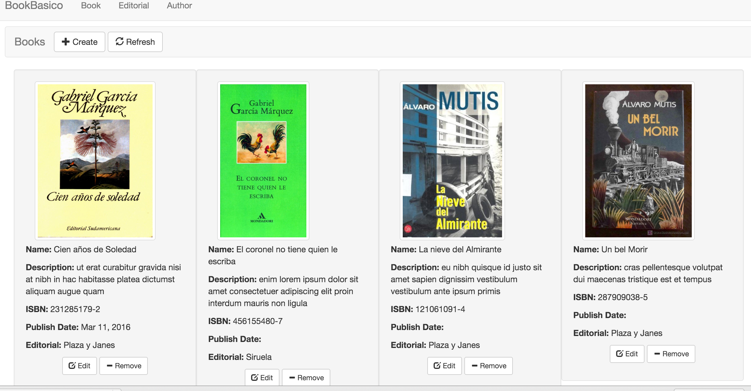 Como se puede apreciar, hay una barra de menús que permite al usuario navegar entre los conceptos de la aplicación. Por cada concepto, existe una forma de ver el conjunto de elementos creados (en el caso de la lista de libros, se ven en forma de galería), de crear uno nuevo, de editar uno existe o de borrar uno existe.