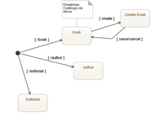La navegación entre los módulos se diseñó siguiendo una noción básica de estados y se implementó utilizando la librería ui-router de angular. La figura 3 representa los estados principales de la aplicación: book, author, editorial. El usuario llega a estos a través de sus acciones sobre la barra de navegación principal.